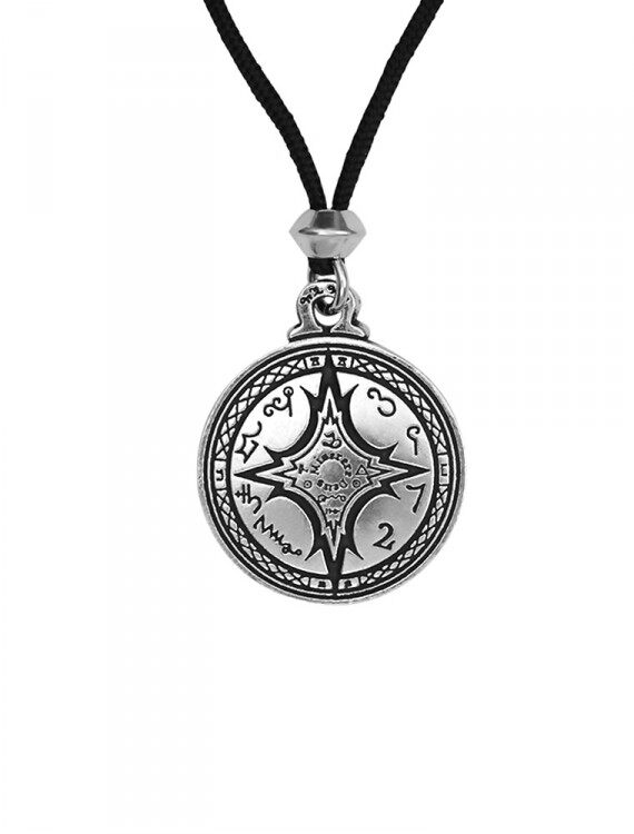 此护身符设计的符号,其神奇的感应帮助获得深刻的知识,任何主题或他们选择研究的魔法艺术。这个护身符的设计灵感来自于魔法书:黑母鸡之书,并包含符号包括天使的信号,炼金术符号和天使的字母。拉丁语�0�9 �0�0在中心解释为祈祷上帝的怜悯。