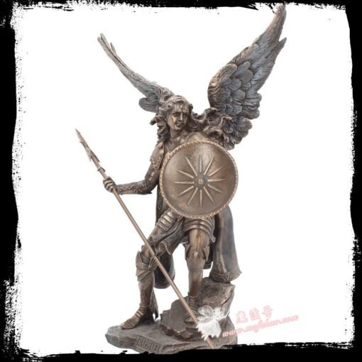 Archangel Raphael拿着矛和盾牌。这个惊人的雕像是非常精美和手工的完成青铜雕塑。约35cm。