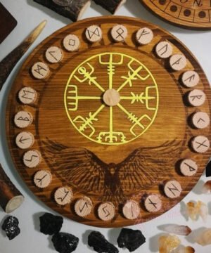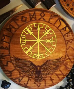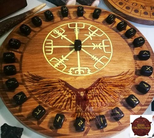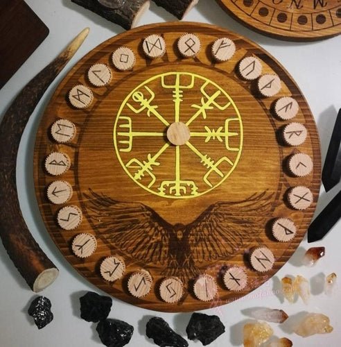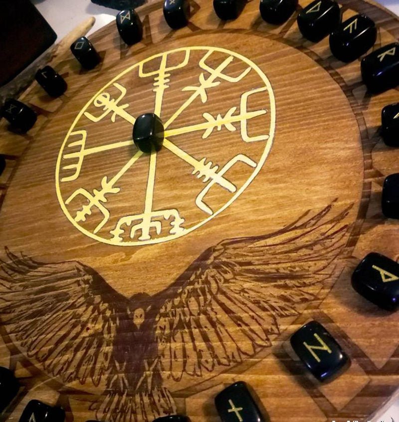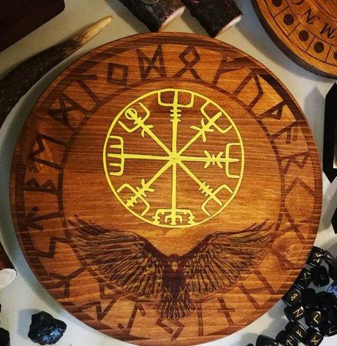 符文,占卜,乌鸦烙印的符文桌,上面有符文,封印和乌鸦。Vegvìsir是一个强大的符号,可以帮助我们在身心上不会迷失方向,实际上,在古代,该符号主要用于带有吉祥符号的海上旅行。在桌子上,除了符文,我们还决定在与奥丁神有关的地方刻上乌鸦。就像后者的两只乌鸦一样,这种动物具有信使的功能,在我们占卜的过程中,它将为我们抓住我们所寻找的信息。